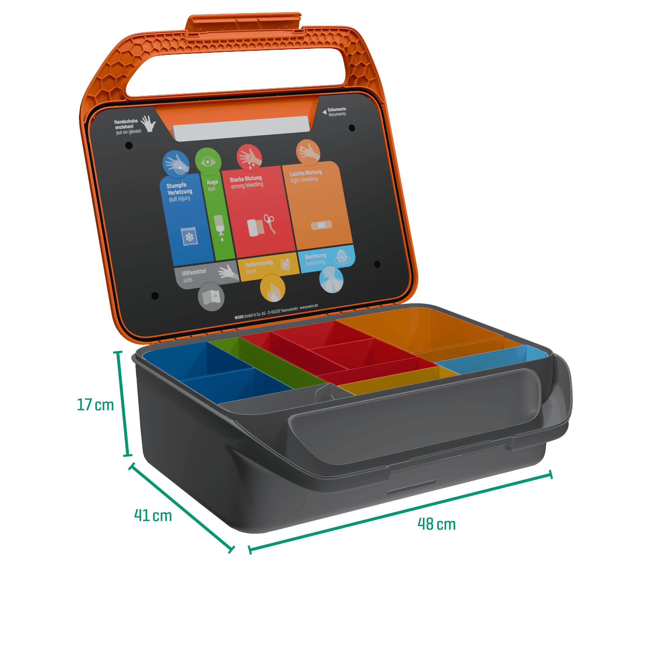 • Robuster, hygienisch abwischbarer Koffer in Signalorange – gut sichtbar und platzsparend montierbar.