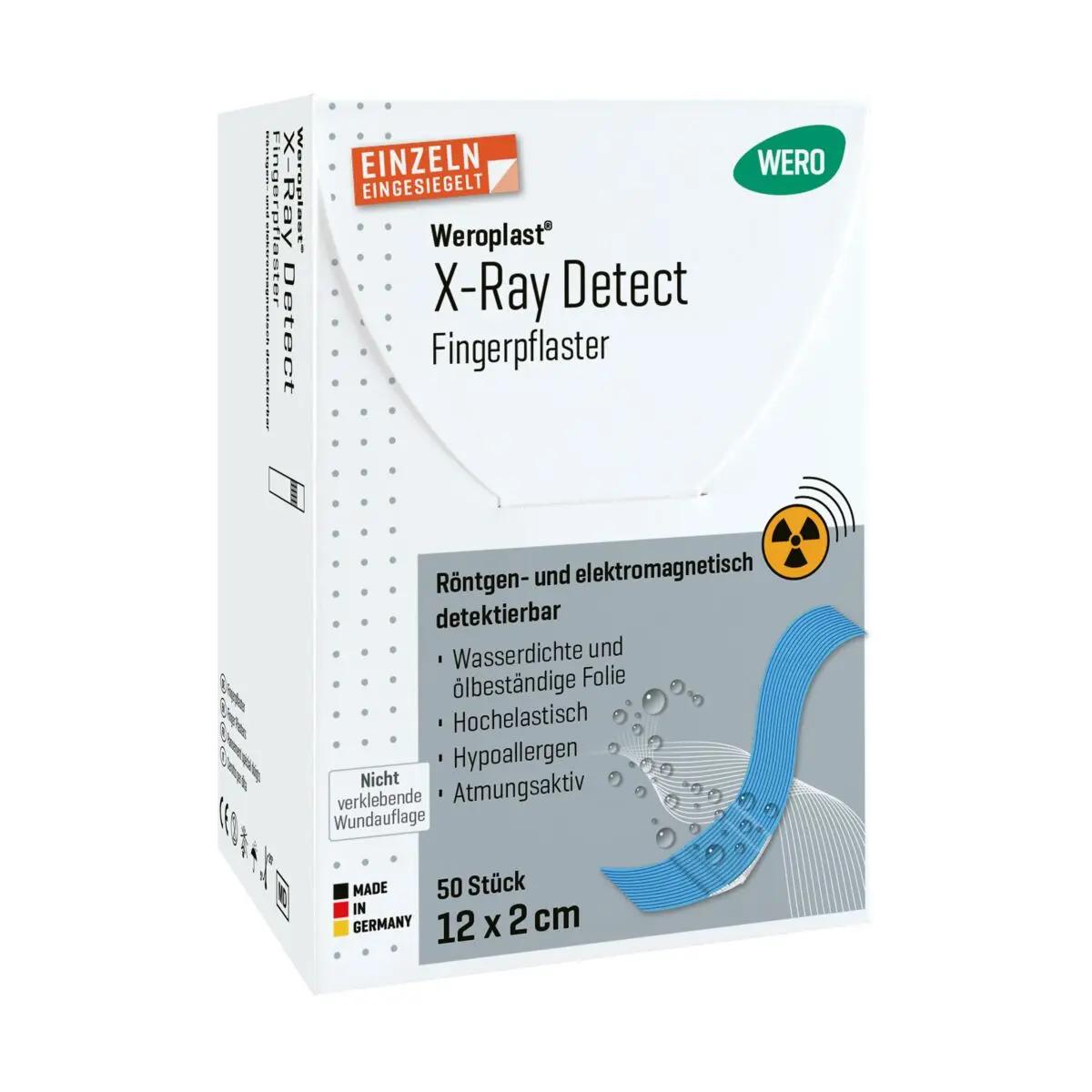 Weroplast ® X-Ray Detect plasters are recognised by both metal detectors and X-ray detectors. In addition to the aluminium foil used in conventional metal detectors, there is an additional tape under the wound dressing made of a material that can be detected by X-ray devices. Weroplast® X-Ray Detect is therefore recommended as a universally applicable plaster in food processing and the supply industry.