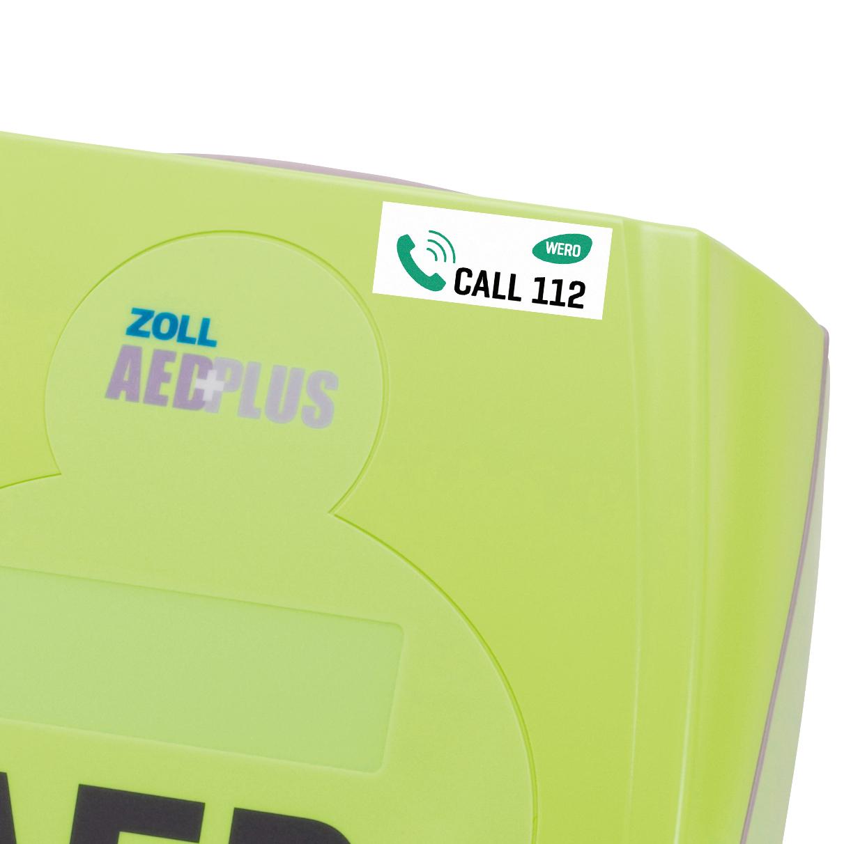 Der Hinweis CALL 112 macht die Notrufnummer sofort sichtbar und einprägsam.