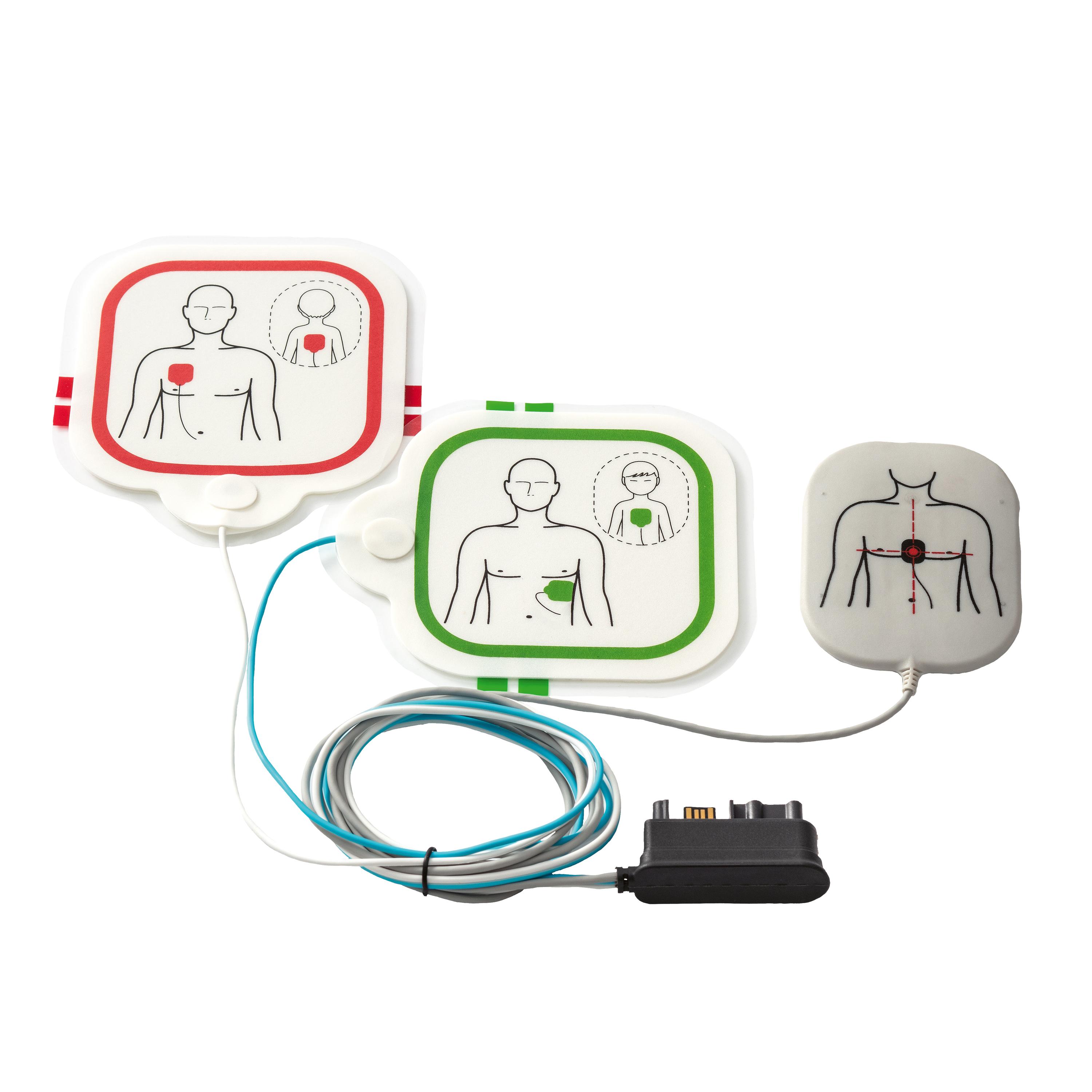 Unser Defibrillator-Set enthält eine Elektrode mit einem CPR-Feedback-Sensor und ein 4,3-Zoll-Farbdisplay, das animierte Anweisungen zur Anwendung bietet.