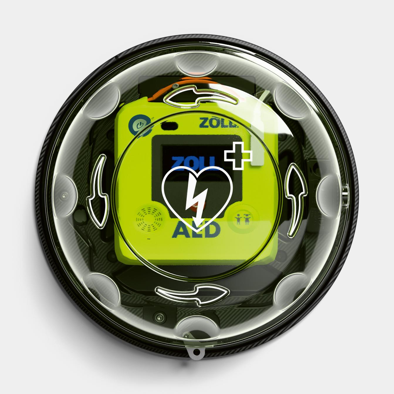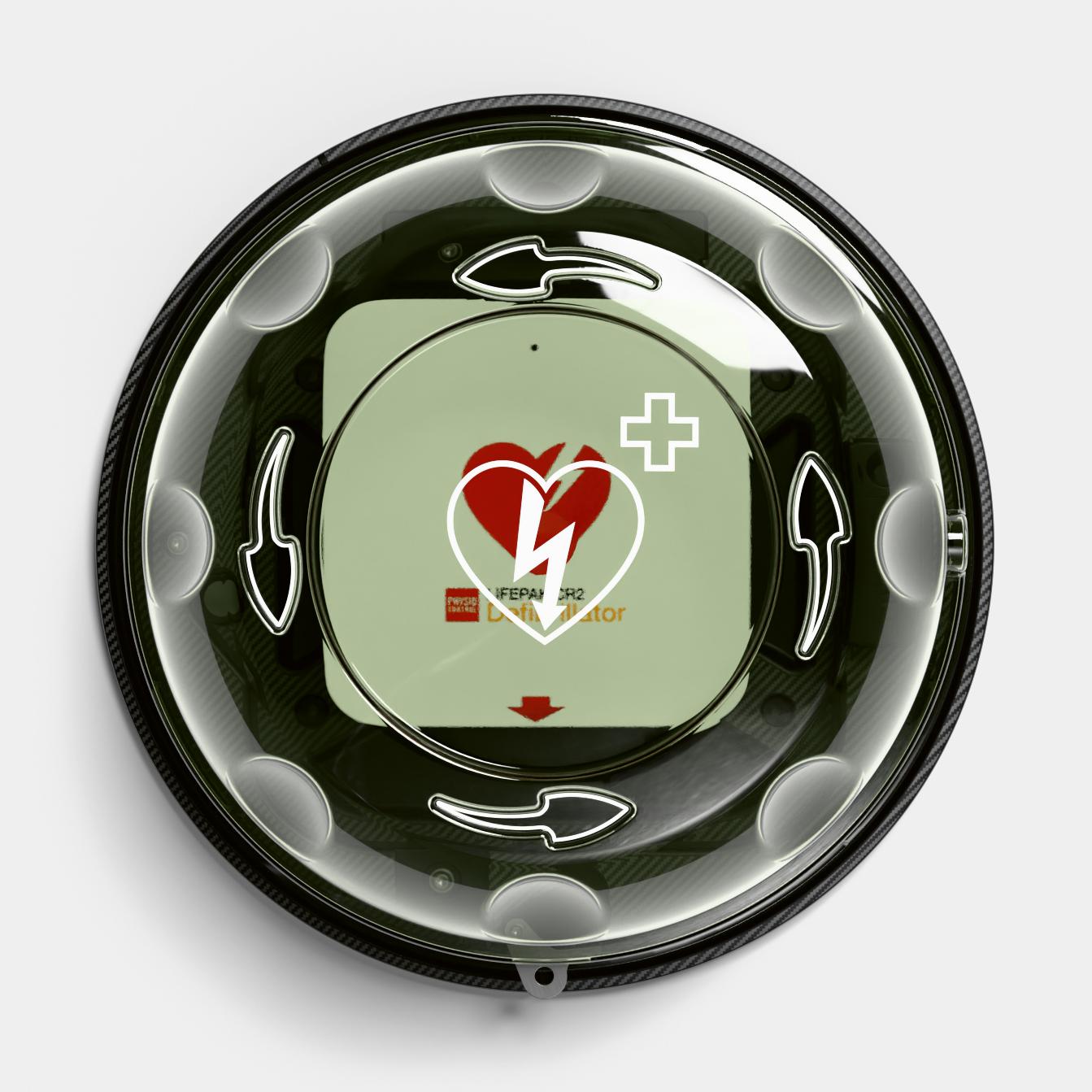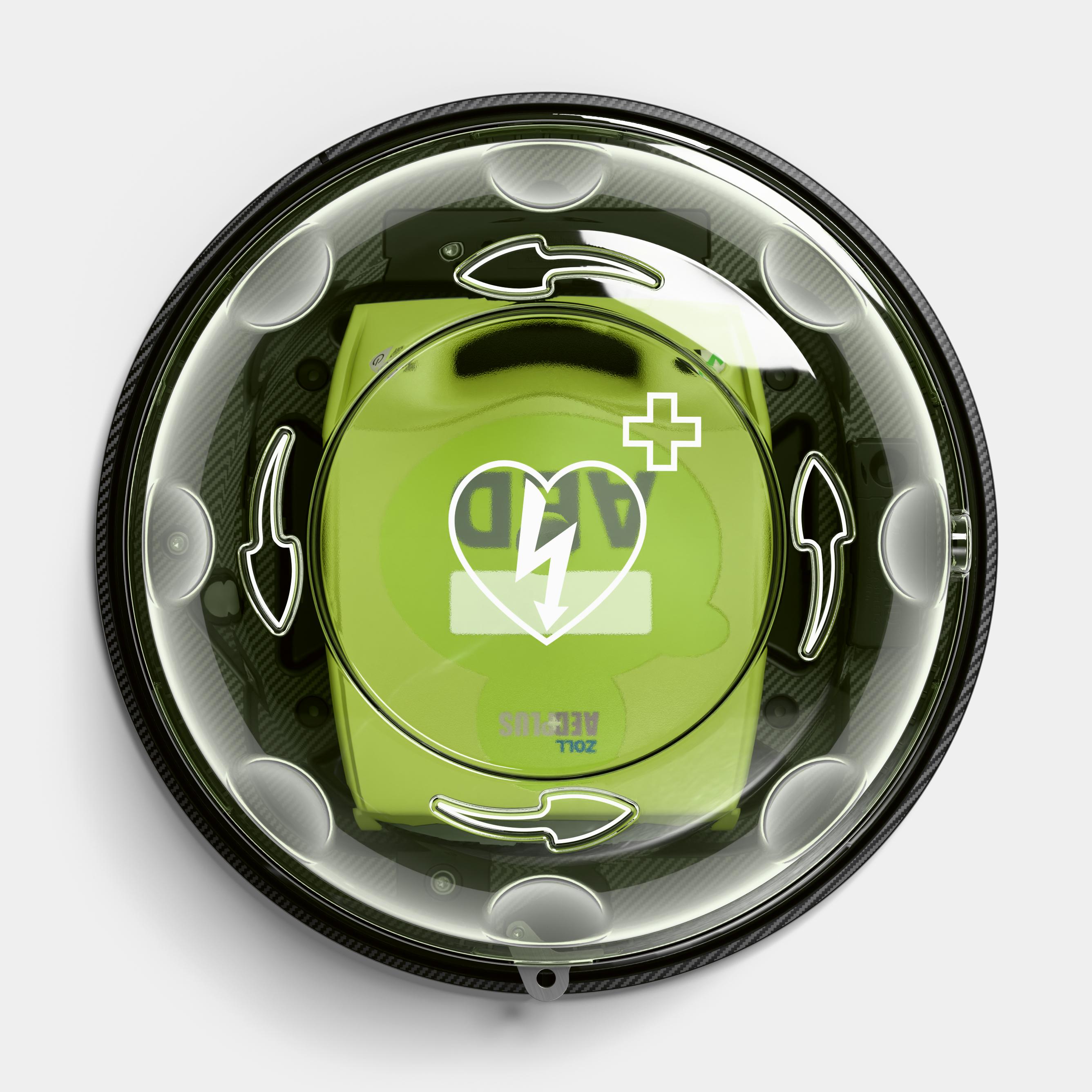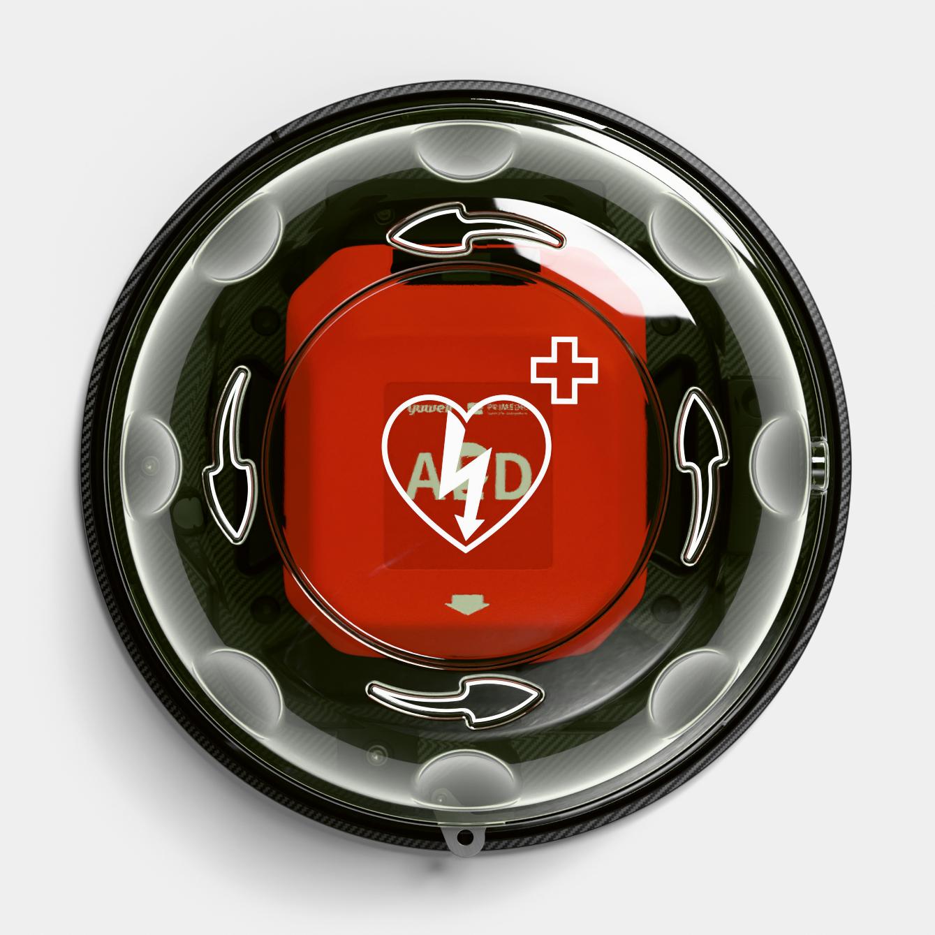 Das runde Design mit klar gekennzeichnetem AED-Symbol und Drehmechanismus ermöglicht eine schnelle und unkomplizierte Öffnung des Gehäuses. Der Deckel bleibt über ein sicheres Gurtsystem am Gehäuse befestigt – so geht bei der Entnahme nichts verloren. Ein akustisches Alarmsignal (84–98 dB) wird beim Öffnen ausgelöst, um auf den Einsatz aufmerksam zu machen und unbefugte Nutzung zu verhindern.