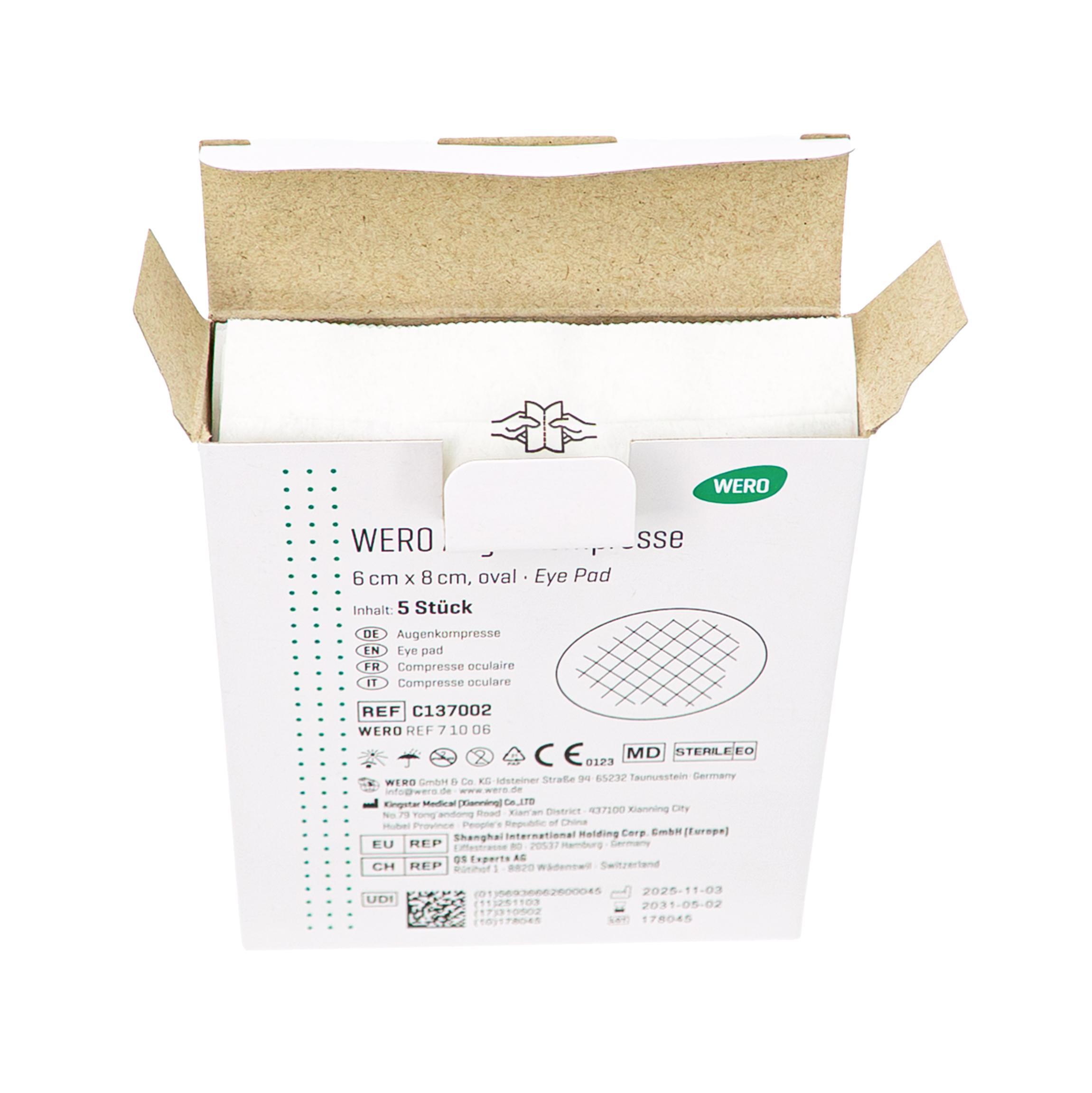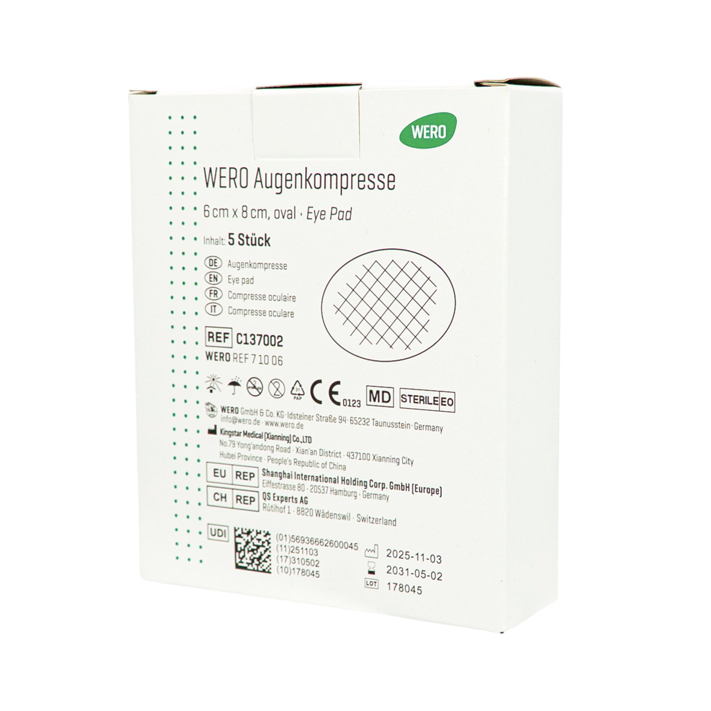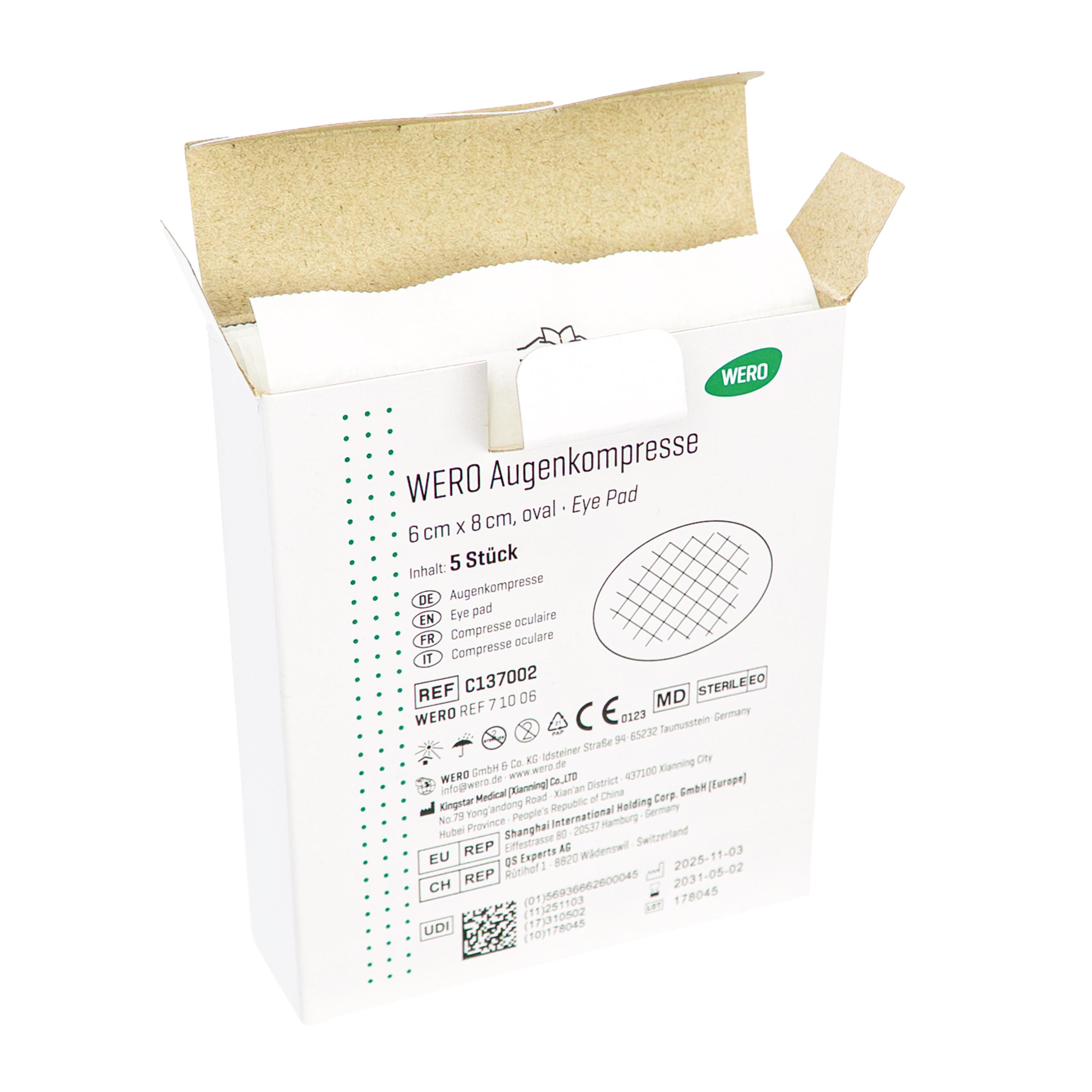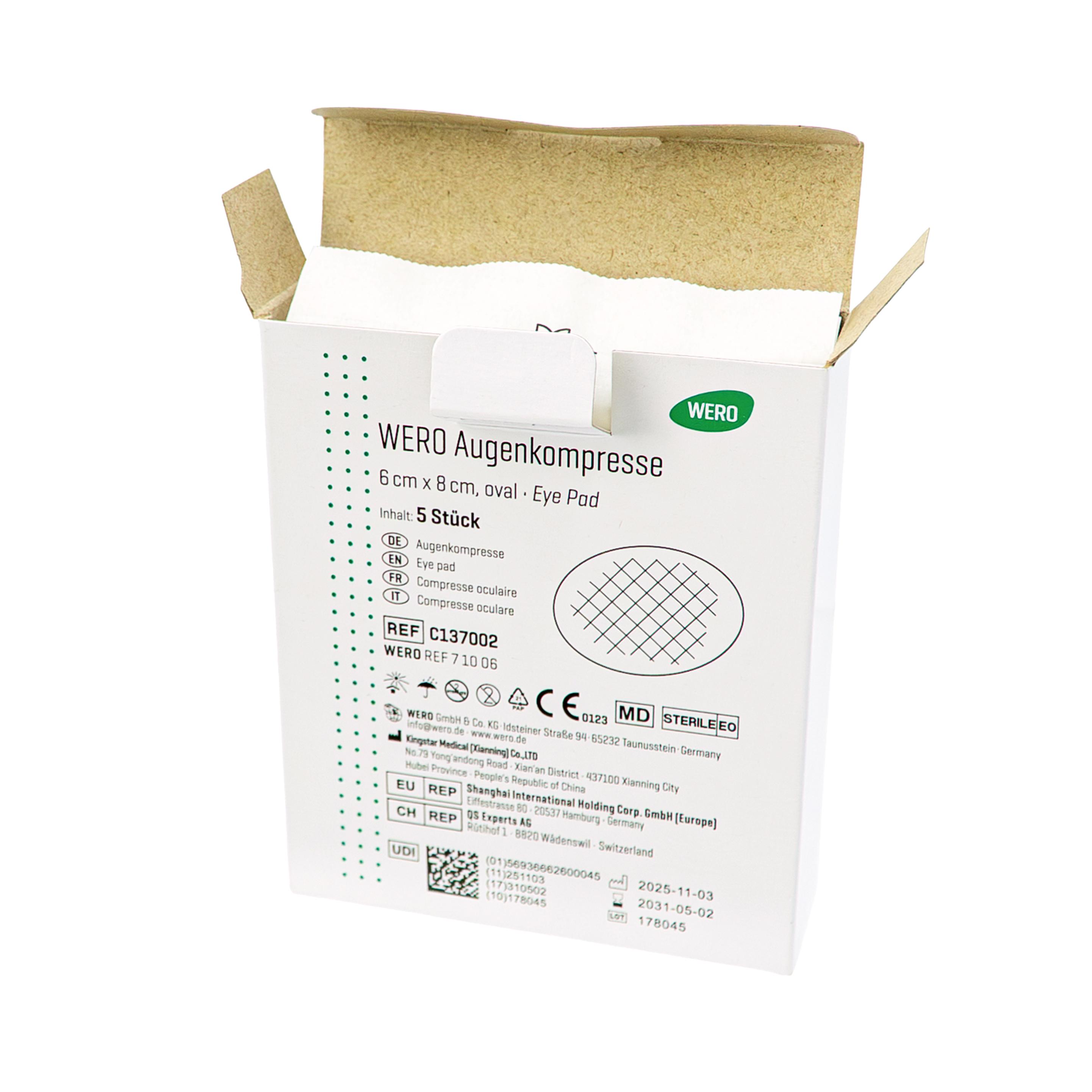 Jede Augenkompresse ist einzeln steril verpackt, um maximale Hygiene und Schutz vor Kontamination zu gewährleisten. Die Sterilverpackung macht sie besonders geeignet für den Einsatz in Krankenhäusern, Arztpraxen und der häuslichen Pflege.