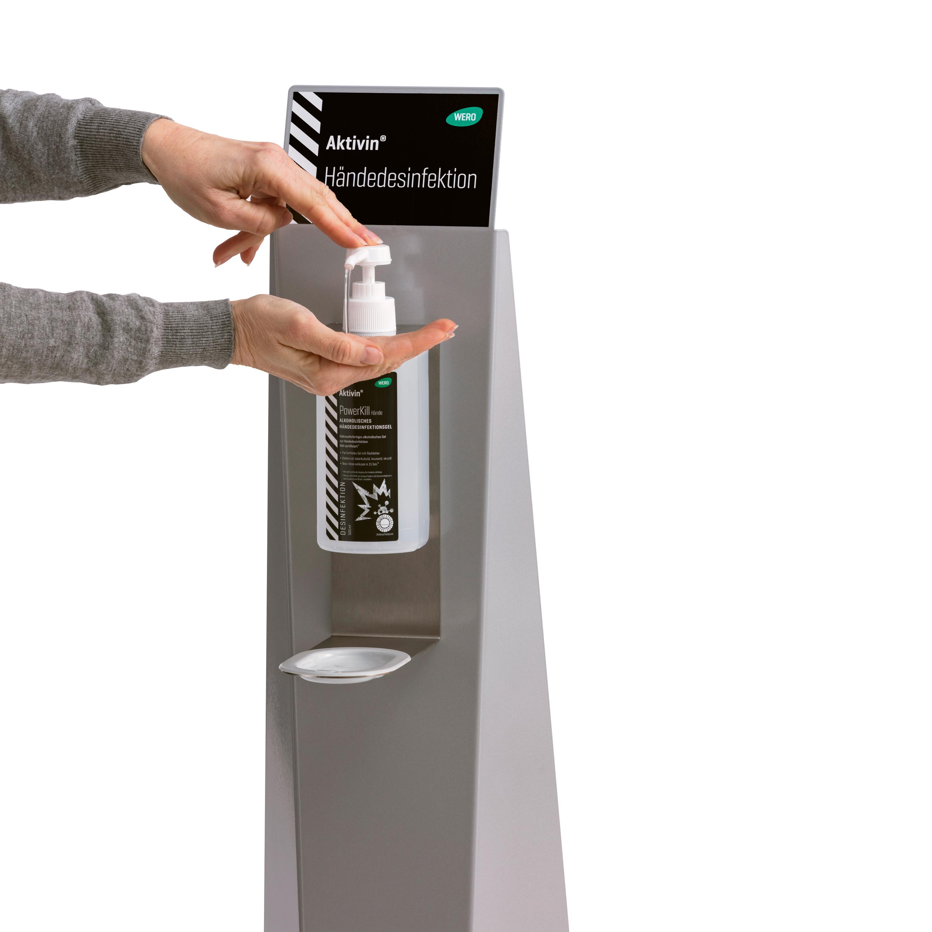 Die Montage kann sowohl an der Wand als auch an unserem Aktivin® Händedesinfektionsständer (REF 20210200) erfolgen. Durch die Unterlegscheiben kann der Halter für verschiedene Flaschenhalsweiten verwendet und in Kombination mit einer Dosierpumpe (nicht im Lieferumfang enthalten) mit Desinfektionsmitteln, Flüssigseifen oder Lotionen bestückt werden.