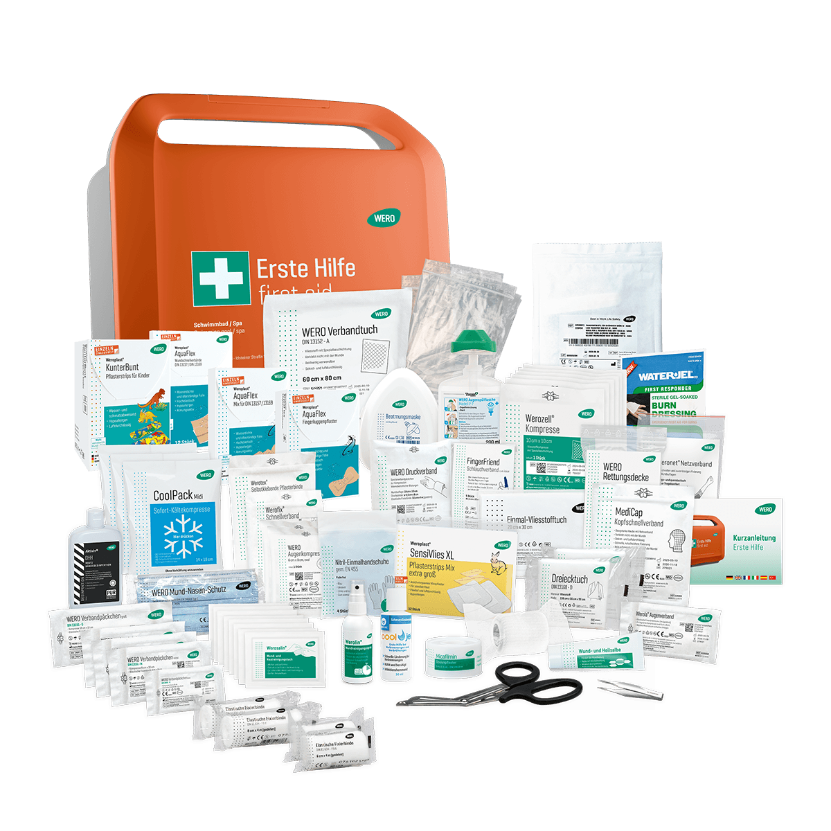 Sicherheit am und im Becken ist Pflicht: Unser WERO Smart Case® Erste-Hilfe-Koffer Schwimmbad ist speziell für typische Gefahrenpotenziale und Verletzungen in Hallen- und Freibädern, Hotelpools sowie Wellness- und Spabereichen konzipiert. Der Erste-Hilfe-Koffer beinhaltet neben der Basisausstattung nach DIN 13157 eine branchenbezogene Erweiterung für Badeanlagen.